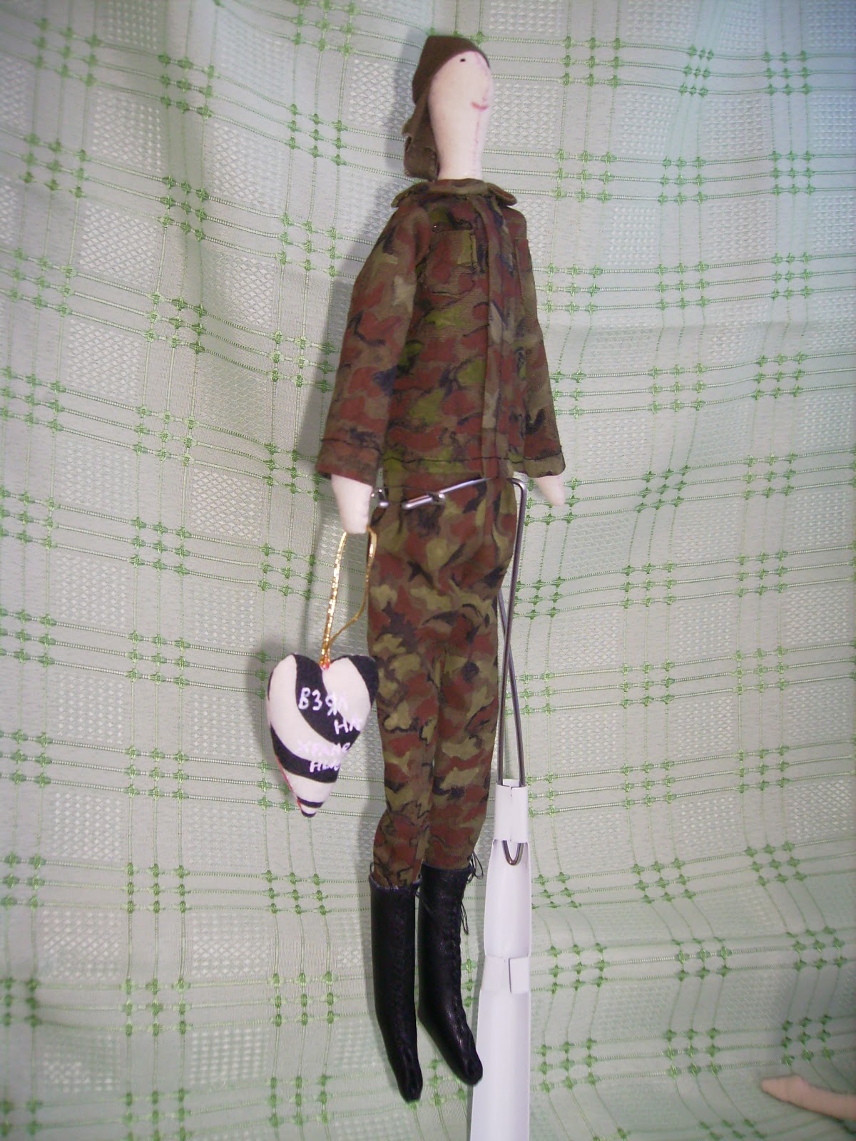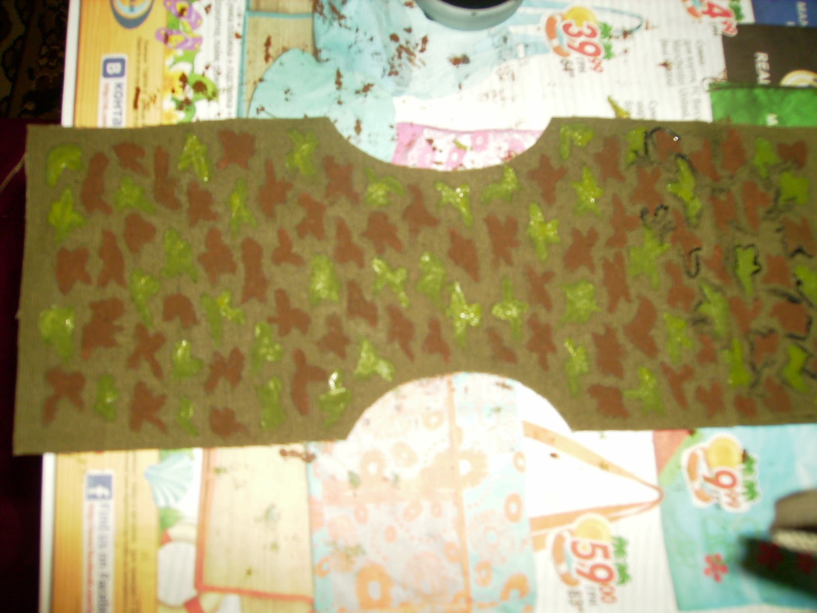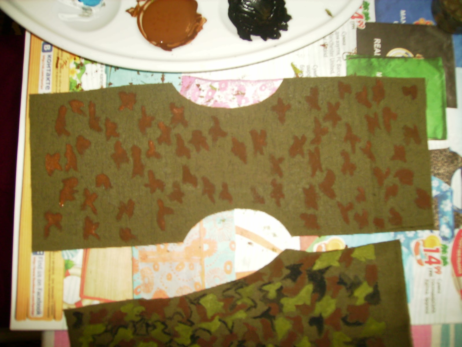 Взялась ) Все бы хорошо, только где взять материал для пошива формы? Можно было бы искать в тканевых магазинах, НО обычная ткань нужной расцветки была бы с большими разводами и одного пятнышка хватило бы на пошив всего костюма! Меня спасли акриловые краски для росписи ткани и ткань защитного цвета. Каждое пятнышко рисовалось вручную, долго и старательно)